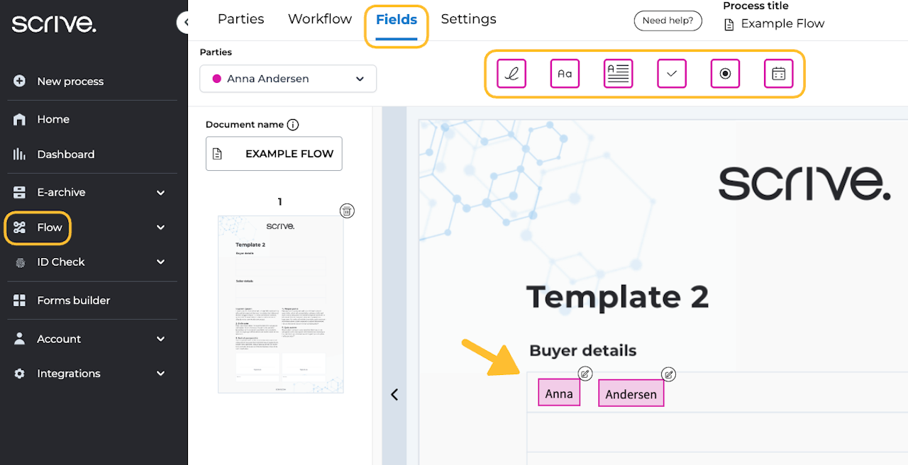 After uploading documents for your signing workflow, you can enhance them by adding fields. This functionality is particularly beneficial for embedding information from your parties into the document or for collecting specific details from a party throughout the signing process.