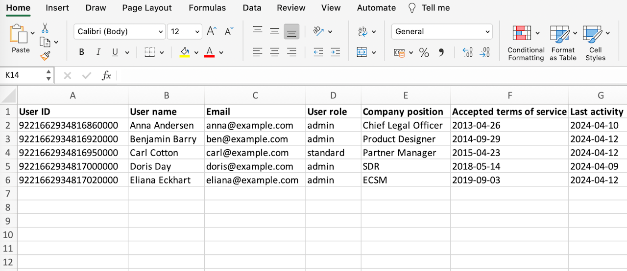 • All usage including all users (CSV): This file contains statistics for all users, including inactive ones.