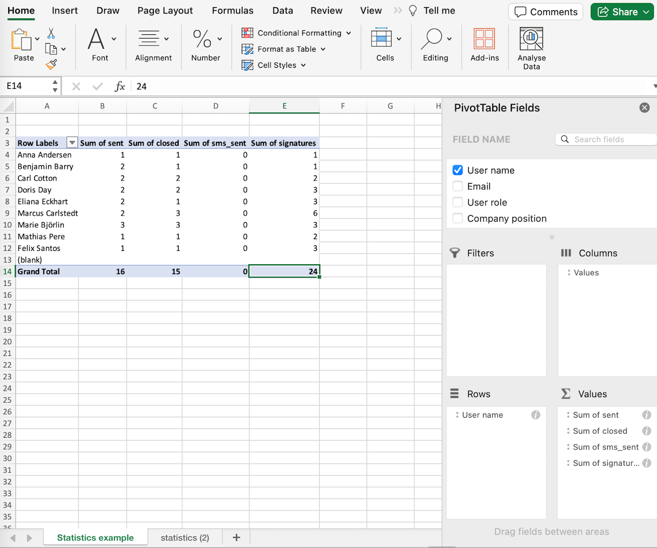 We suggest starting by dragging either 'Email' or 'User name' to Rows, which will arrange all your users neatly. Then, simply drag the data you wish to analyse into the columns.