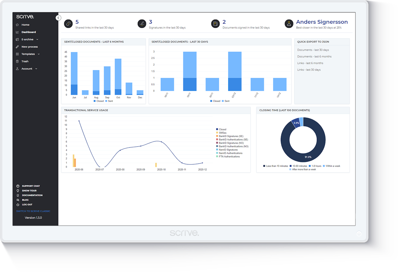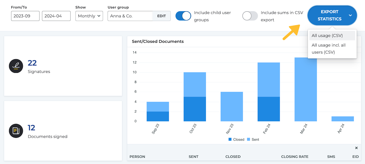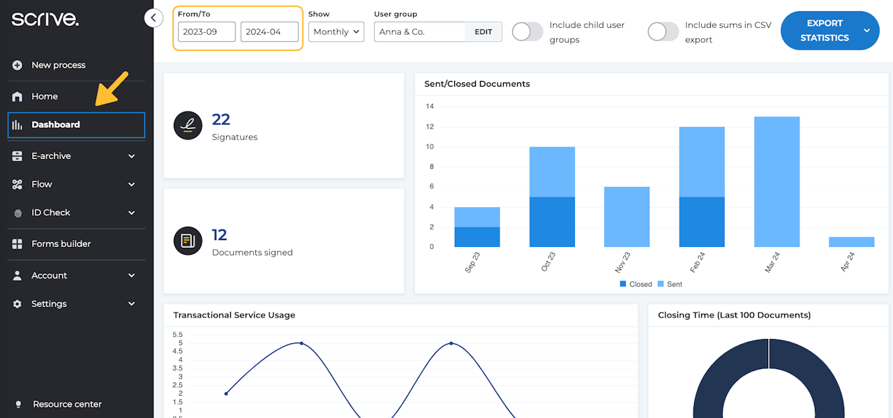 • Closed: The total number of documents closed, meaning all signatories in the process have signed.