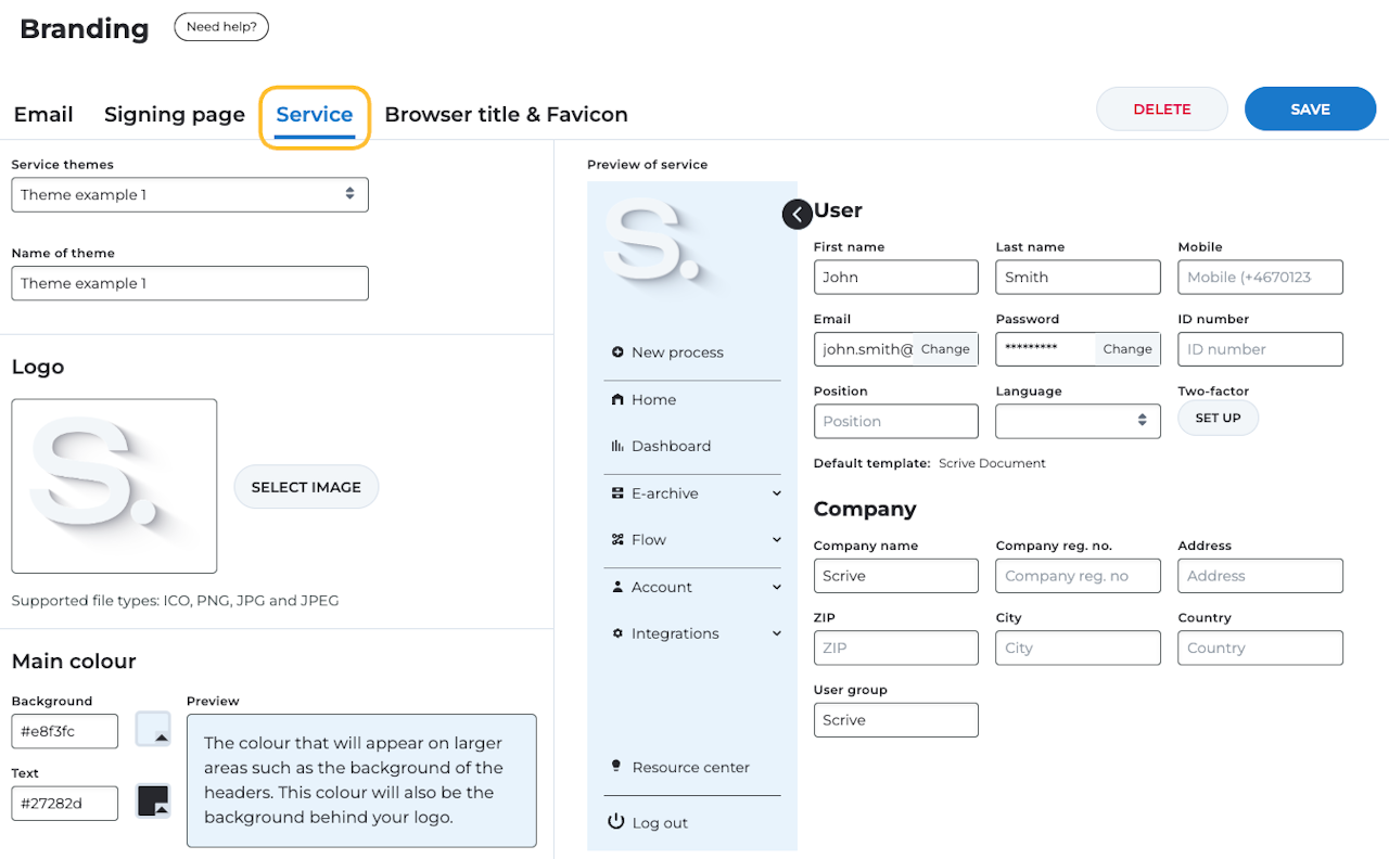 Branding lets you customise the eSign experience with your organisation’s colours, logo, and messaging. This applies to Scrive users, customers, and signing parties.