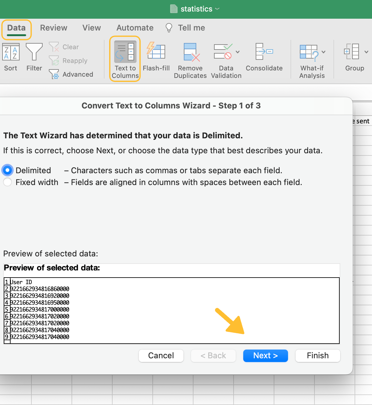 5. Choose 'Delimited' and click 'Next'