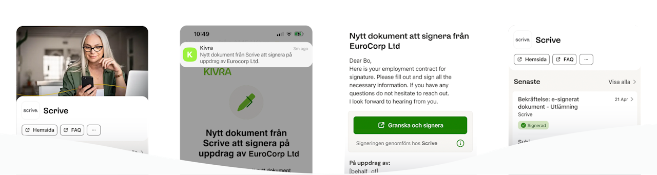 With Scrive’s integration with Kivra, you can send agreements straight to a recipient’s Kivra inbox, just like you would via SMS or email, but with the added trust and security of Sweden’s most widely used digital mailbox. No lost emails or links, just a seamless, secure signing experience.