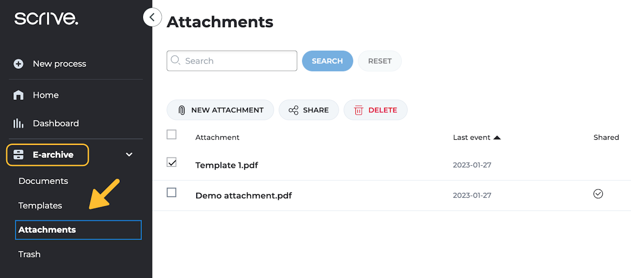 Find your stored attachments in the E-archive by navigating through the main menu on your left. On the 'Attachments' page, you can upload new attachments for storage, share them with your colleagues or delete those you no longer need.
