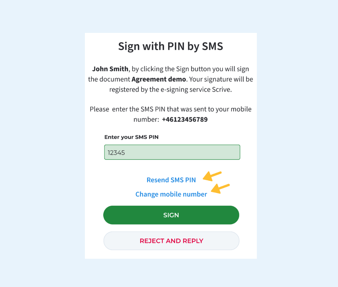 When utilising PIN by SMS for authentication during the signing process, users can resend the SMS PIN code to their mobile number if needed. This option becomes available again after 60 seconds. Additionally, if necessary, users can modify the mobile number they initially provided.