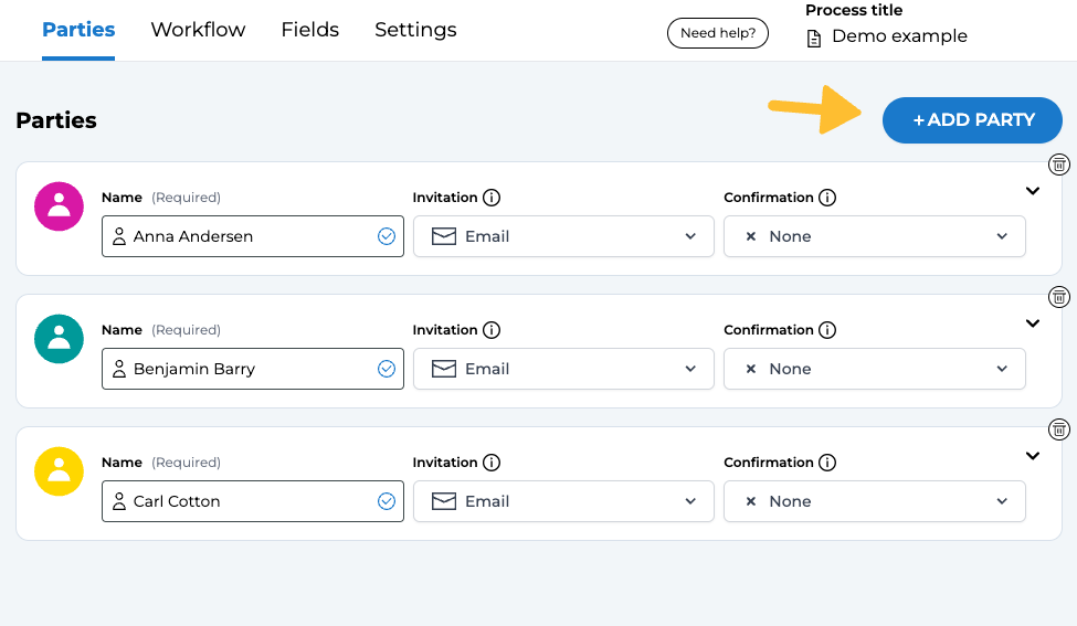 A minimum of two parties is required for each process. To include additional parties, simply click on the blue "+ Add party" button.