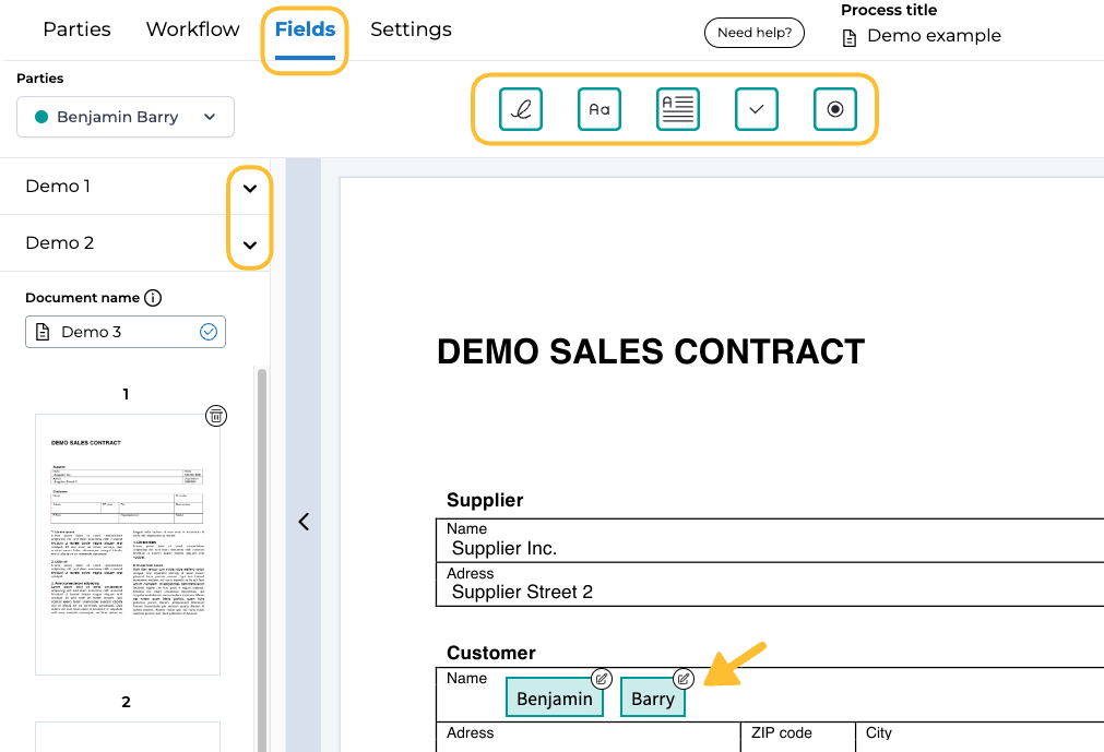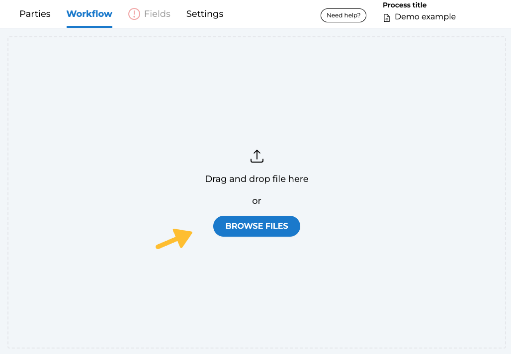 After uploading the documents to be included in your signing workflow, you have the option to add fields to collect information from your parties or to include additional details. Navigate to the "Fields" tab to view these settings.