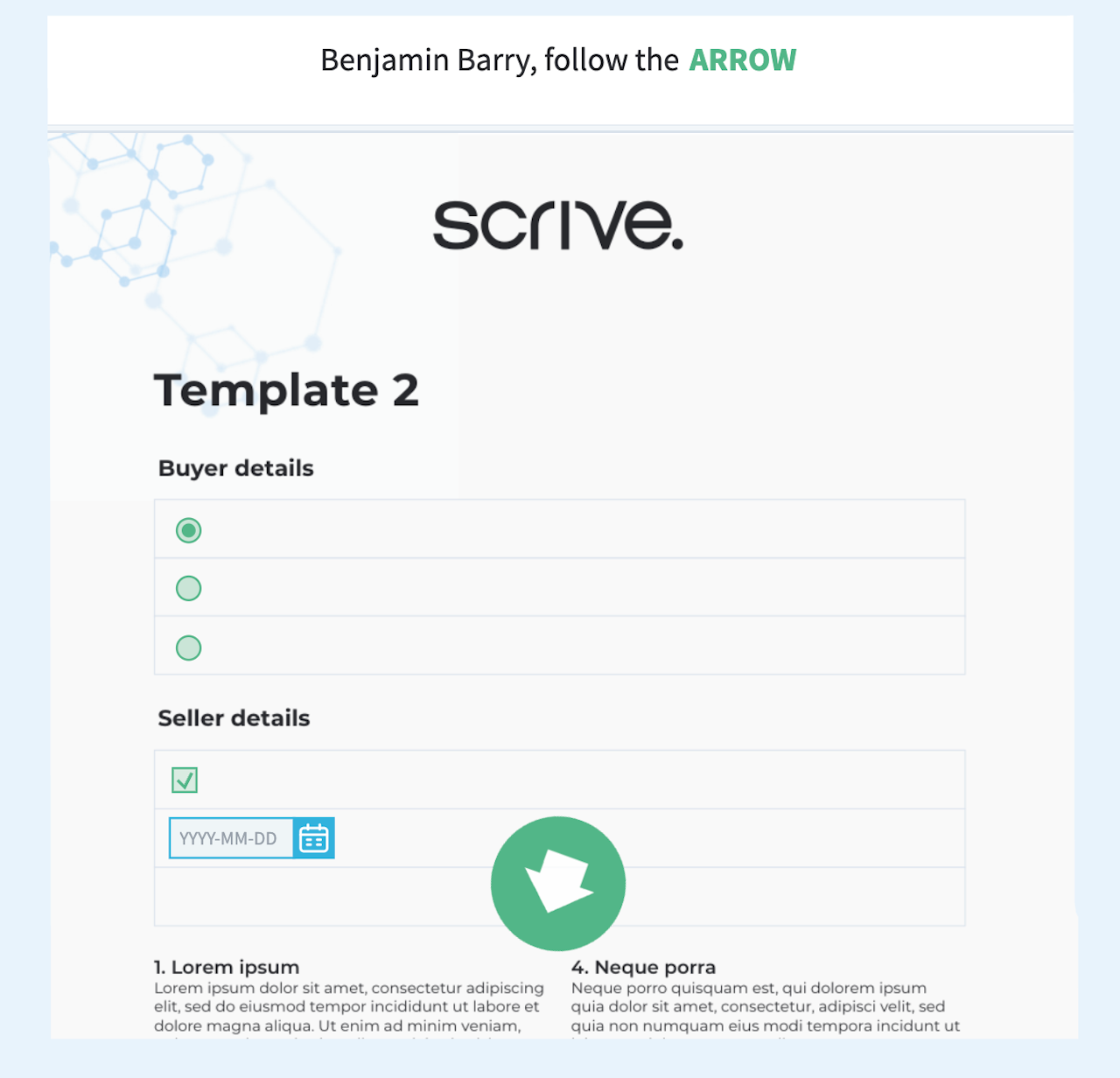 Depending on what settings the sender has used, you may see fields in the document marked for you to fill out. These can be shown in the shape of text fields, checkboxes, date fields etc. There may also be a green arrow guiding you through the document to ensure that you do not miss anything.