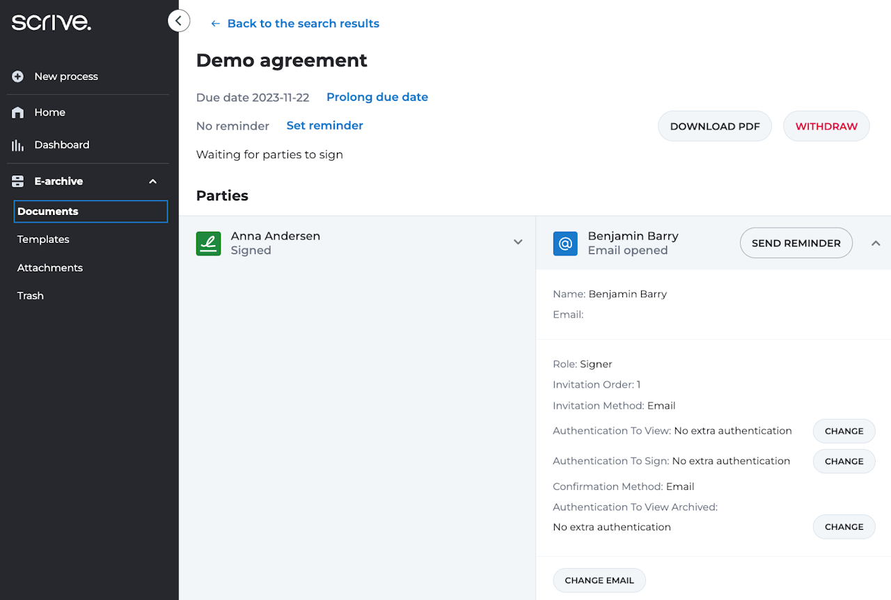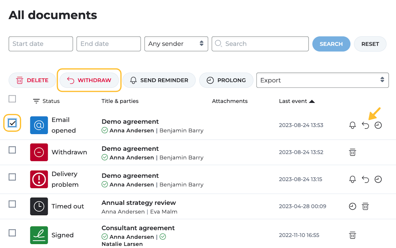 By withdrawing a document, you will instantly cancel the signing process and the previously sent invitations to open the document will automatically expire. Parties will not be notified about this.