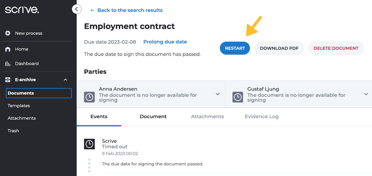 To restart a signing process after it was either timed out, withdrawn or rejected: