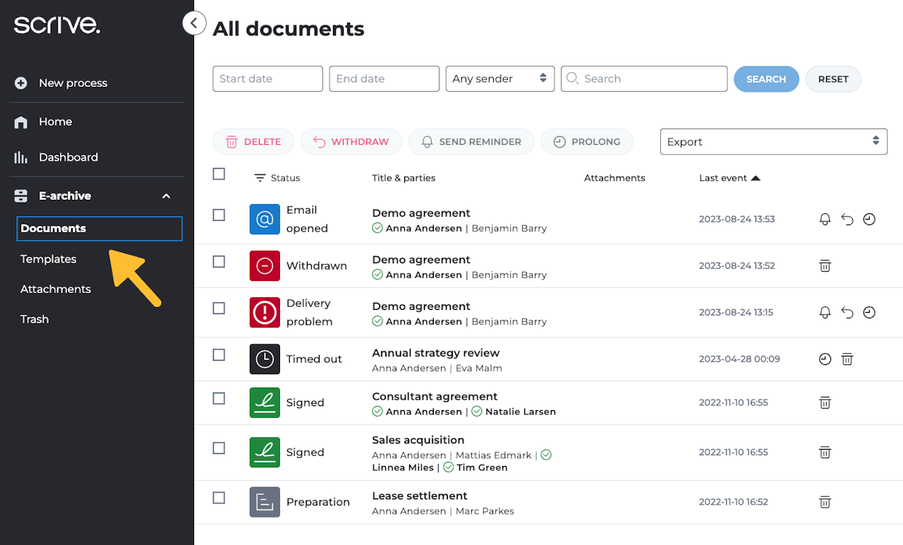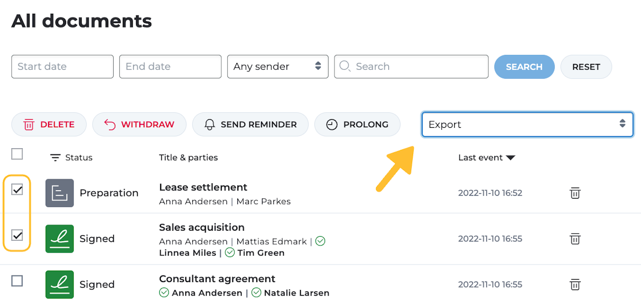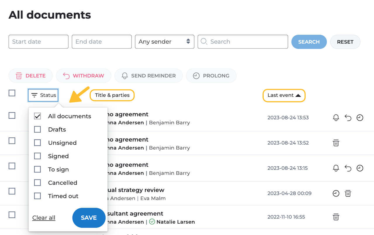 In addition, you can refine your search by filtering documents by status: drafts, unsigned documents, signed documents, documents waiting to be signed by you, cancelled processes and timed out processes.