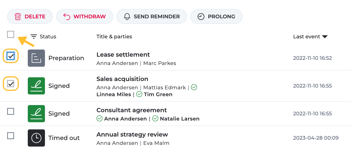 The available actions depend on the document's status and enable you to quickly delete, send reminders, withdraw, or extend the process due date.